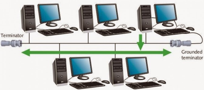 - Topologi Bus: Semua perangkat terhubung ke satu kabel utama. Kelebihannya sederhana dan murah, tetapi jika kabel utama putus, seluruh jaringan akan lumpuh.